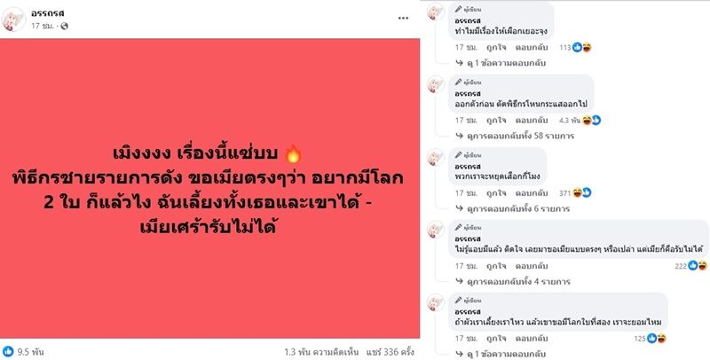 จากกรณีเพจดัง อรรถรส เปิดประเด็นแซ่บกลางโซเชียลว่า “เมิงงงง เรื่องนี้แซ่บบ พิธีกรชายรายการดัง ขอเมียตรงๆว่าอยากมีโลก 2 ใบ ก็แล้วไง ฉันเลี้ยงทั้งเธอและเขาได้ - เมียเศร้ารับไม่ได้”