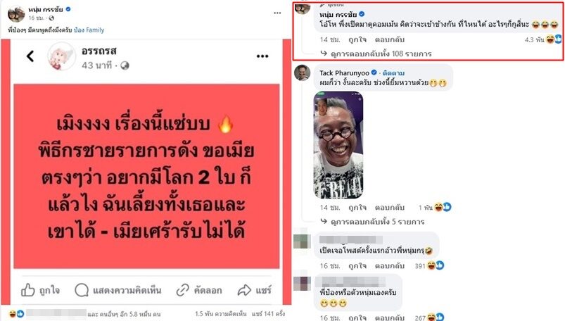 งานนี้ร้อนถึงพิธีดังแถวหน้า หนุ่ม กรรชัย ก็ถึงกับโพสต์แล้ว โดยได้แคปโพสต์ของเพจอรรถรส พร้อมแซวไปถึง ป๋อง กพล เพื่อนซี้ว่า “พี่ป๋องๆ มีคนพูดถึงมึงครับ ป๋อง Family”
