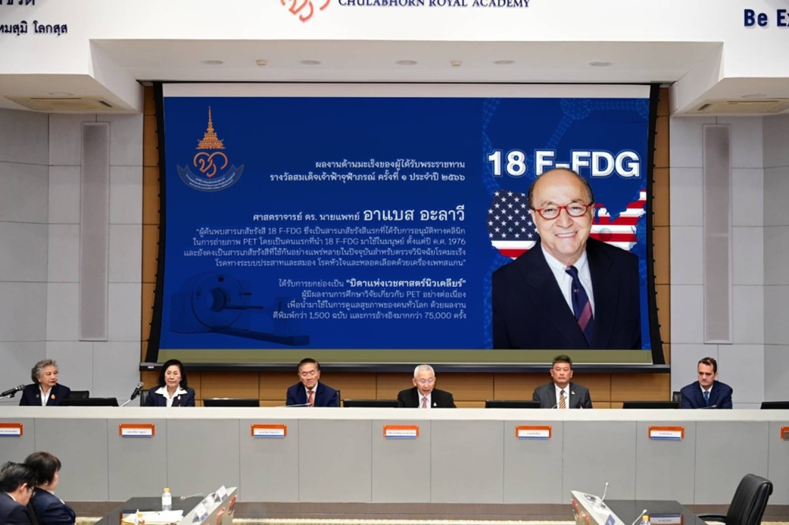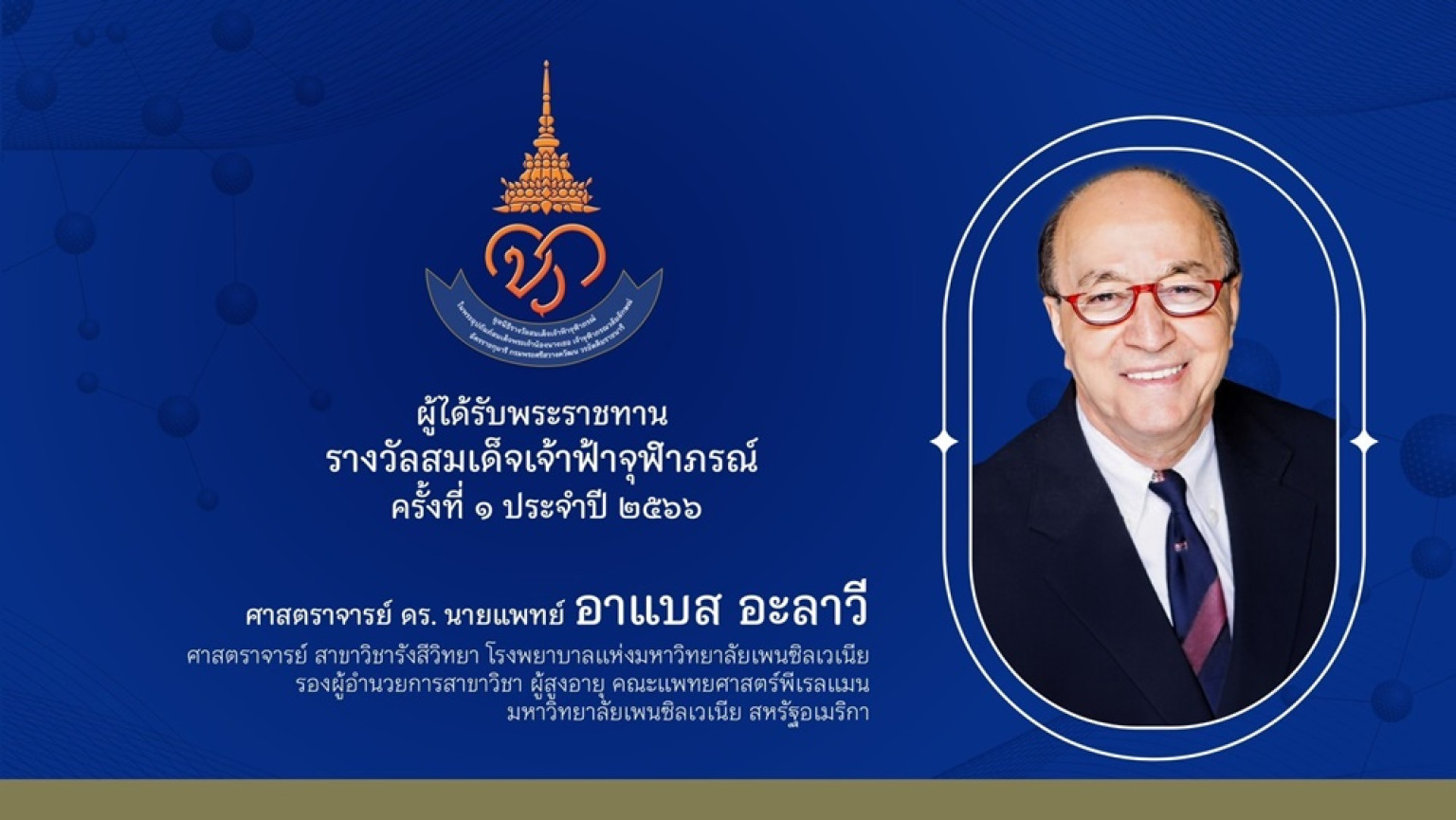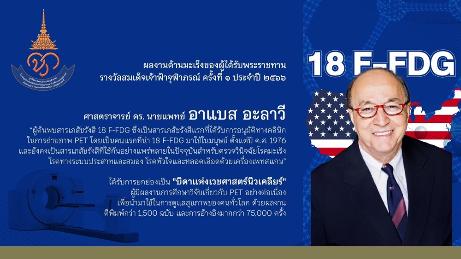 สำหรับ ผู้ได้รับพระราชทานรางวัลสมเด็จเจ้าฟ้าจุฬาภรณ์ ครั้งที่ 1 ประจำปี 2566 ได้แก่ ศาสตราจารย์ ดร. นายแพทย์อาแบส อะลาวี (Abass Alavi, MD, MD(Hon), PHD(Hon), DSc(Hon)) ศาสตราจารย์ สาขาวิชารังสีวิทยา โรงพยาบาลแห่งมหาวิทยาลัยเพนซิลเวเนีย รองผู้อำนวยการสาขาวิชา ผู้สูงอายุ คณะแพทย์ศาสตร์พีเรลแมน มหาวิทยาลัยเพนซิลเวเนีย สหรัฐอเมริกา โดย ศาสตราจารย์ ดร.นายแพทย์อาแบส อะลาวี และทีมงานได้คิดค้นแนวคิดในการติดฉลาก deoxyglucose ด้วยฟลูออไรด์ที่เปล่งโพซิตรอน (18F) นำไปสู่การพัฒนา fludeoxyglucose (FDG) ซึ่งเป็นสารเภสัชรังสีแรกที่ได้รับการอนุมัติทางคลินิกในการถ่ายภาพ PET และเป็นสารเภสัชรังสีที่ยังคงใช้กันอย่างแพร่หลายในปัจจุบัน โดยศาสตราจารย์ ดร. นายแพทย์ อาแบส อะลาวี เป็นคนแรกที่นำ 18 F-FDG มาใช้ในมนุษย์ตั้งแต่ในปี ค.ศ. 1976 และทำการถ่ายภาพสมองโดยใช้เครื่องตรวจเอกซเรย์ปล่อยโฟตอนเดี่ยวหรือ single-photon emission tomography (SPET) ที่ผลิตเอง