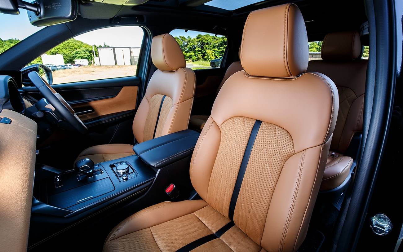 พร้อมที่วางแก้ว ช่อง USB Type C สำหรับชาร์จไฟ 2 ช่องใต้ บริเวณแผงควบคุมเครื่องปรับอากาศบริเวณเบาะนั่งแถวที่สองและห้องโดยสารแบบ 3 แถว 6 ที่นั่ง Captain seat ปรับไฟฟ้า (Power captain seats (6-Seat) และมีแบบ 7 ที่นั่ง สามแถวแบบ 2+3+2 ให้เลือก