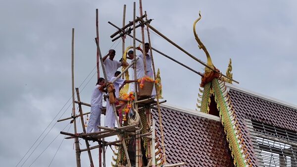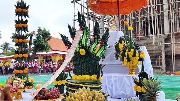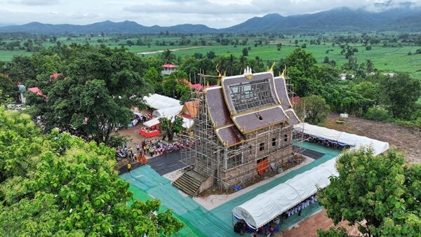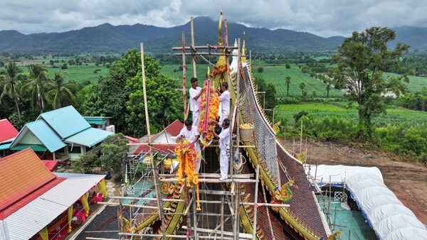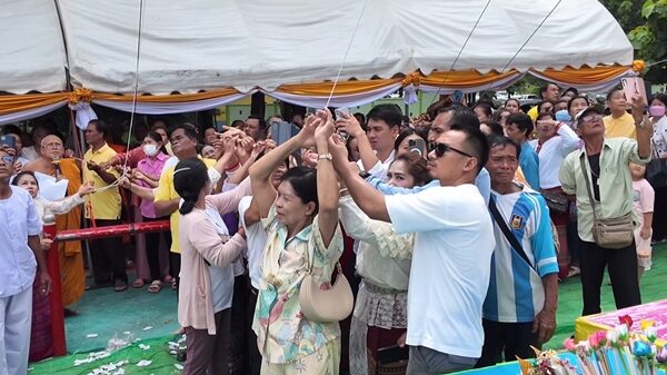 นับพันแห่ร่วมพิธี ยกช่อฟ้าเอกอุโบสถ ส่องเลขเด็ดประทัดหมื่น 3 ตัว 2 ตัว
