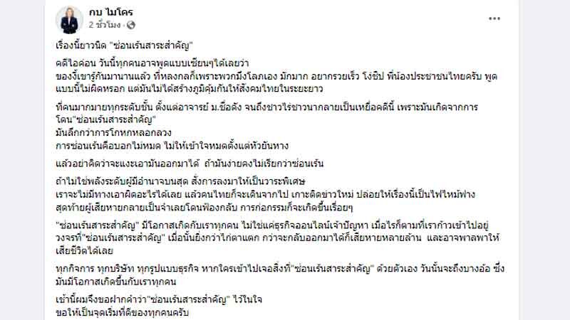 มันลึกกว่าการโกหกหลอกลวง การซ่อนเร้นคือบอกไม่หมด ไม่ให้เข้าใจหมดตั้งแต่หัวยันหาง แล้วอย่าคิดว่าจะแงะเอามันออกมาได้ ถ้ามันง่ายคงไม่เรียกว่าซ่อนเร้น ถ้าไม่ใช่พลังระดับผู้มีอำนาจบนสุด สั่งการลงมาให้เป็นวาระพิเศษ เราจะไม่มีทางเอาผิดอะไรได้เลย แล้วคนไทยก็จะเดินจากไป เกาะติดข่าวใหม่ ปล่อยให้เรื่องนี้เป็นไฟไหม้ฟาง สุดท้ายผู้เสียหายกลายเป็นจำเลยโดนฟ้องกลับ การก่อกรรมก็จะเกิดขึ้นเรื่อยๆ