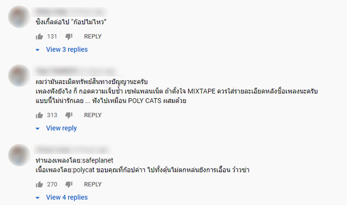 ทั้งนี้ชาวเน็ตยังตั้งข้อสงสัยอีกว่ากอล์ฟ ฟักกลิ้ง ฮีโร่ แรปเปอร์รุ่นใหญ่ที่มาร่วมงานด้วยไม่ได้แสดงความคิดเห็นอะไรในประเด็นที่เกิดขึ้นเลยเหรอหรือแค่แต่งแรปให้ หรืออาจเป็นไปได้ว่าไม่เคยฟังเพลงของวงเซฟ แพลนเน็ต และวงโพลี่ แคท