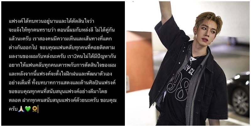 ทั้งนี้ หนุ่มแฟรงค์ ได้โพสต์ข้อความผ่านสตอรี่ไอจี ระบุว่า “แฟรงค์ได้ทบทวนอยู่นานและได้ตัดสินใจว่าจะแจ้งให้ทุกคนทราบว่า ตอนนี้ผมกับหล่งลี ไม่ได้คู่กันแล้วนะครับ เราสองคนมีความเห็นและเส้นทางที่แตกต่างกันออกไป ขอบคุณแฟนคลับทุกคนที่คอยติดตามผลงานของผมกับหล่งนะครับ”