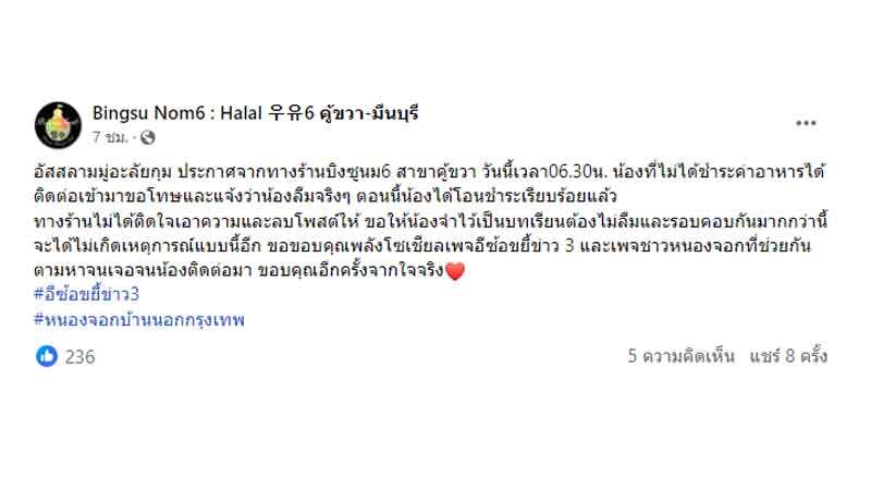 ทั้งนี้พบว่า เพจร้าน Bingsu Nom6 : Halal 우유6 คู้ขวา-มีนบุรี โพสต์แจ้งต่อกรณีดังกล่าวว่า ประกาศจากทางร้านบิงซูนม6 สาขาคู้ขวา วันนี้เวลา 06.30 น. น้องที่ไม่ได้ชำระค่าอาหารได้ติดต่อเข้ามาขอโทษและแจ้งว่าน้องลืมจริง ๆ ตอนนี้น้องได้โอนชำระเรียบร้อยแล้ว
