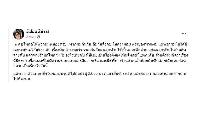 กรณีเพจ อีซ้อขยี้ข่าว3 โพสต์ประกาศตามหา กลุ่มลูกค้าที่มากินบิงซูเกือบ 3,000 บาท แล้วลืมจ่ายเงิน เห็นทางร้านบอกว่าค่อย ๆ ทยอยเดินออกไปเข้าห้องน้ำและหายไปทีละคน โดยมากินที่ร้านบิงซูนมหก สาขาคู้ขวา เวลาประมาณ 18.00 น. แล้วไม่ได้จ่ายเงิน (หรือลืมจ่ายเงินให้ติดต่อมาจ่ายด่วนเลยค่ะ) ใครรู้จักรบกวนติดต่อน้องกลุ่มนี้หน่อยค่ะ ยอดที่ต้องชำระ 2,655 บาท (ไม่ได้มีเจตนาประจานนะคะ ขอแค่มาจ่ายแล้วจะลบโพสต์ค่ะ)