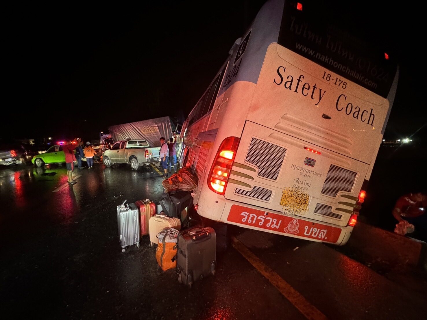 ระทึก ฝนตกถนนลื่น อุบัติเหตุซ้ำซ้อน รถชนกันหลายคัน รถทัวร์ตกร่องกลางถนน ผู้โดยสารเต็มคันรถ 30 กว่าคน ปลอดภัยไม่ได้รับบาดเจ็บ