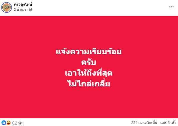 ล่าสุดลุงโทนี่ออกมาระบุว่า "ได้ดำเนินการแจ้งความแล้วเป็นที่เรียบร้อย แจ้งความเรียบร้อย พร้อมที่จำดำเนินคดีให้ถึงที่สุด ไม่ไกล่เกลี่ย"