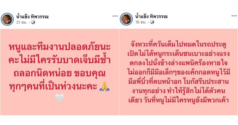 โดยน้ำแข็ง บอกว่า “หนูและทีมงานปลอดภัยนะคะ ไม่มีใครรับบาดเจ็บ มีช้ำถลอกนิดหน่อย ขอบคุณทุกๆ คนที่เป็นห่วงนะคะ”