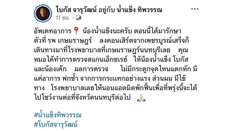 ด้าน โบกัส จารุวัฒน์ ทีมมงานที่อยู่ในเหตุการณ์ ได้อัพเดตเพิ่มเติมว่า “อัพเดตอาการน้องน้ำแข็งนะครับ ตอนนี้ได้มารักษาตัวที่ รพ.เกษมราษฎร์ ลงคอนเสิร์ตจากเพชรบูรณ์เสร็จก็เดินทางมาที่โรงพยาบาลที่เกษมราษฎร์นนทบุรีเลย คุณหมอได้ทำการตรวจสแกนเอ็กซเรย์ ให้น้องน้ำแข็ง โบกัส และน้องเค้ก”