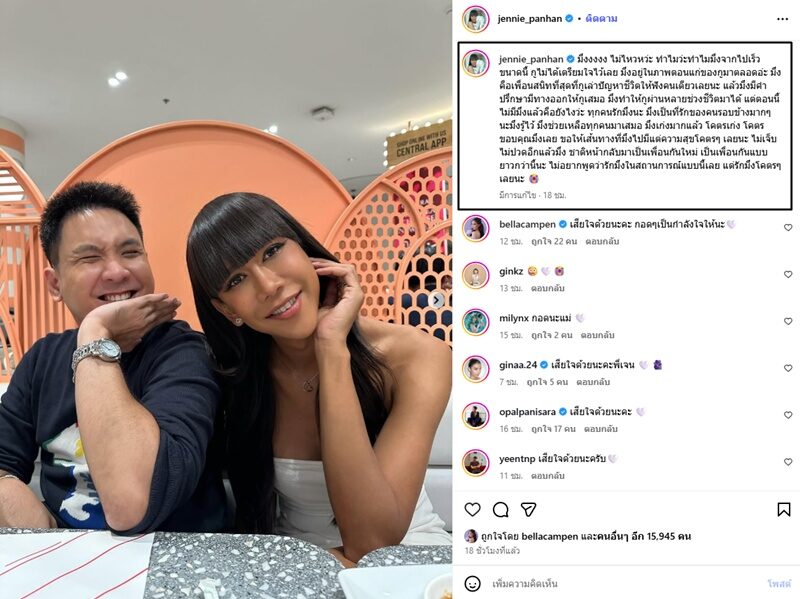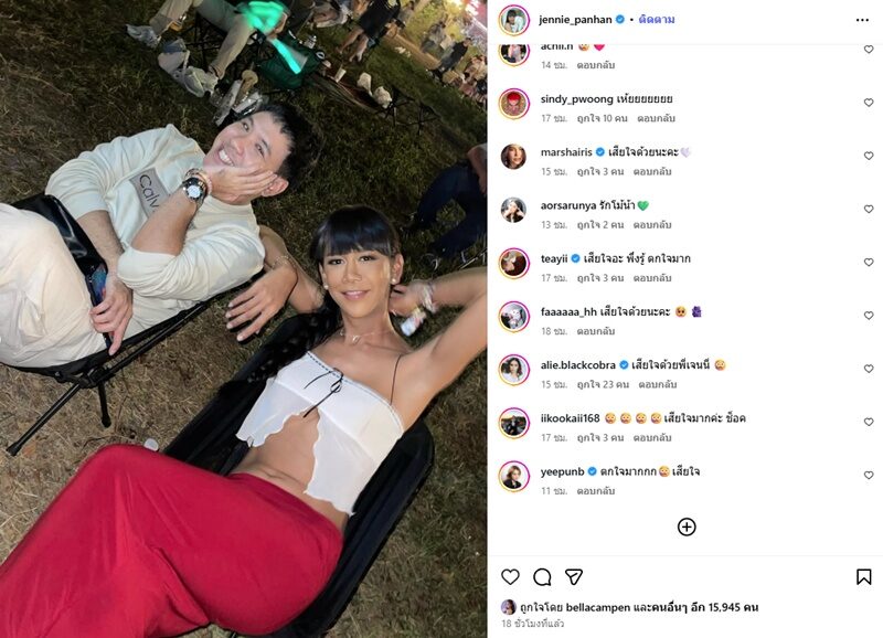 โดยมีคอมเมนต์จากเพื่อนๆในวงการบันเทิงและแฟนๆเข้ามาร่วมแสดงความเสียใจจำนวนมาก อาทิ เบลล่า ราณี ก็ร่วมแสดงความเสียใจด้วยว่า “เสียใจด้วยนะคะ กอดๆเป็นกำลังใจให้นะ” ,โอปอล์ ปาณิสรา ก็คอมเมนต์เช่นกันว่า “เสียใจด้วยนะคะ” รวมทั้ง ปิงปอง ธงชัย , มาช่า วัฒนพานิช , จีน่า เดอะเฟซ ด้วยเป็นต้น
