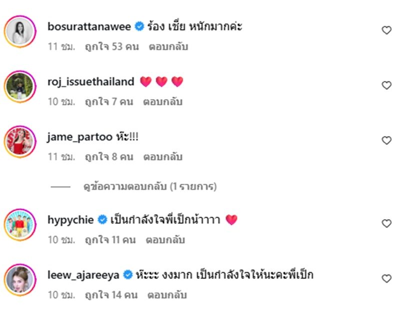 โดยมีคอมเมนต์ทั้งจากคนบันเทิงคนดังเข้ามาส่งกำลังใจจำนวนมาก พร้อมทั้งอุทานตกใจกันรัวๆ อาทิ เด็บบี่ บาซู ก็บอกว่า “สู้ค่ะพี่สาว ส่งกำลังใจ” , โบ สุรัตนาวี ก็อุทานแรงว่า “ร้อง เชี่ย หนักมากค่ะ” , หลิว อาจารียา ก็คอมเมนต์ว่า “ห๊ะะะ งงมาก เป็นกำลังใจให้นะคะพี่เป็ก ” รวมทั้งมีคอมเมนต์ให้สู้กลับด้วย เป็นต้น