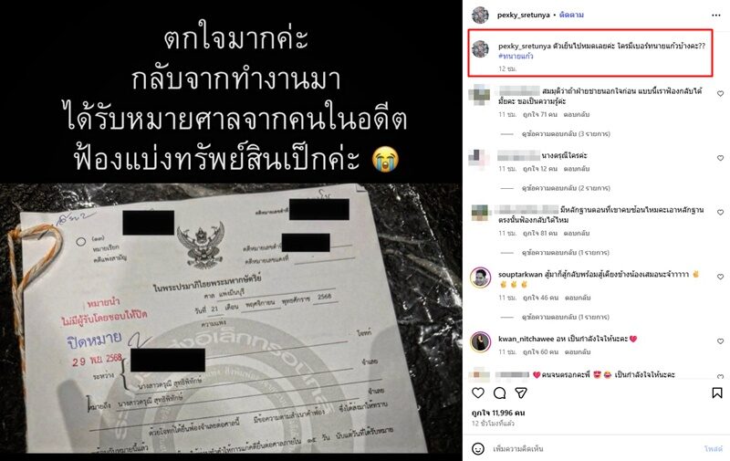 อ่านข่าวต้นฉบับได้ที่ : เป็กกี้ ตกใจมากเจอหมายศาลจากคนในอดีต ฟ้องแบ่งทรัพย์สิน ลั่นขอเบอร์ทนายดัง