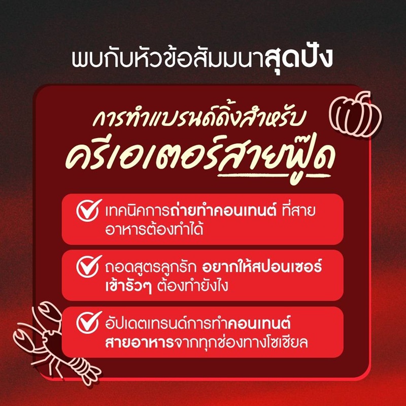 • คอนเทนต์สายอาหารไม่ต้องทำ Branding จริงหรอ โดย “แอ๊ม - ศรัณย์ แบ่งกุศลจิต” เจ้าของช่อง Tiktok การตลาดการเตลิด รวมเทรนด์การทำ Branding สำหรับครีเอเตอร์สายอาหารต้องรู้ สิ่งที่ครีเอเตอร์ต้องมี
