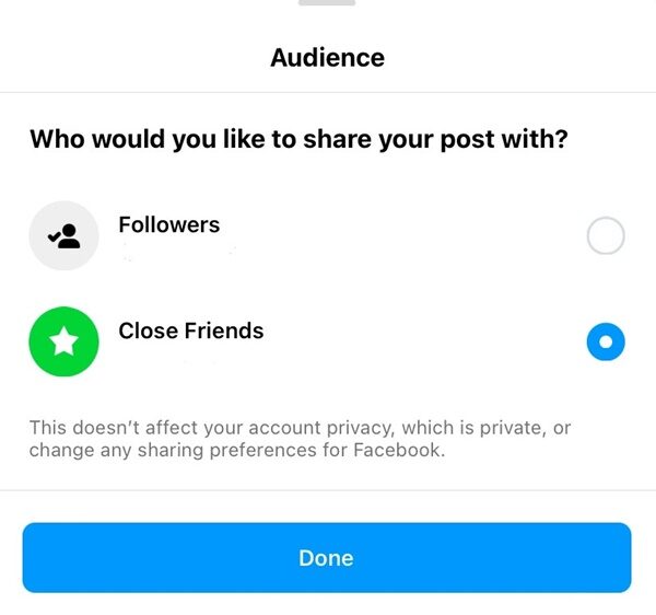 โดย ผู้ใช้งานอินสตาแกรม จะสามารถเลือกกดผู้ชมหรือผู้เห็นโพสต์ของตัวเอง (Audience) ให้เป็นแบบ Close Friends ซึ่งลักษณะจะขึ้นเป็นวงกลมสีเขียวได้