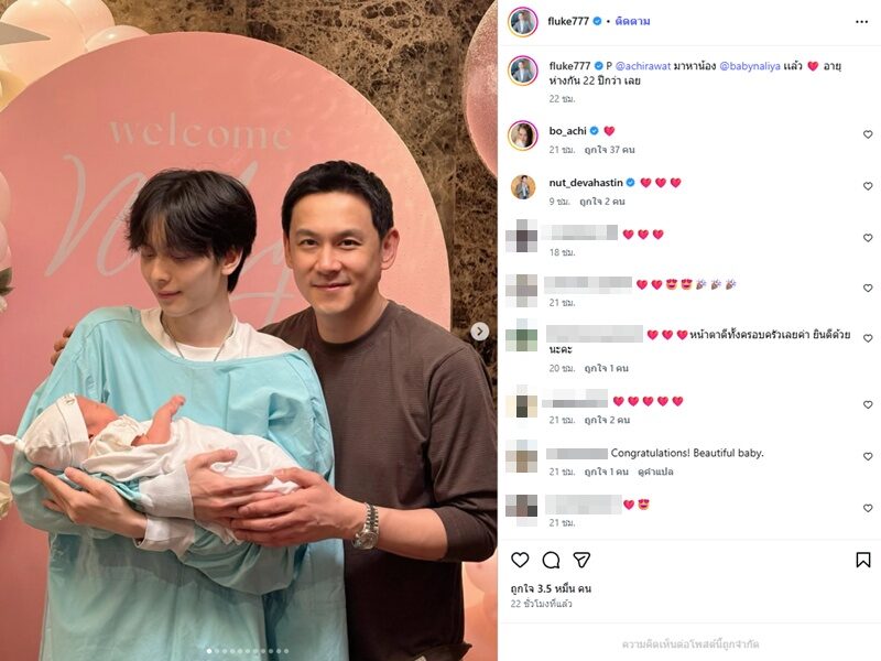 “P @achirawat มาหาน้อง @babynaliya เเล้ว อายุห่างกัน 22 ปีกว่า เลย” โดยแฟนๆต่างก็เข้ามาคอมเมนต์ชมความน่ารักทั้งครอบครัว โดยเฉพาะสายตาละมุนของพี่ชายที่มองน้องสาวอบอุ่นมากๆ