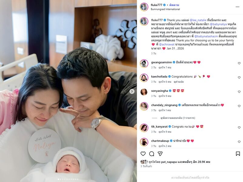 “และมองตามเวลาคุณพ่อจับมือคุยกับหนูตลอดเวลา พี่ @babynatashacm ตื่นเต้นเเละดูจะเห่อหนูมากที่สุดเลย Thank you for choosing us to be your family พี่ @achirawat น่ารอเจอหนูไม่ไหวแล้วเเละ ก็คงหลงหนูเหมือนพี่นาตาชา Jan 31 , 2026”