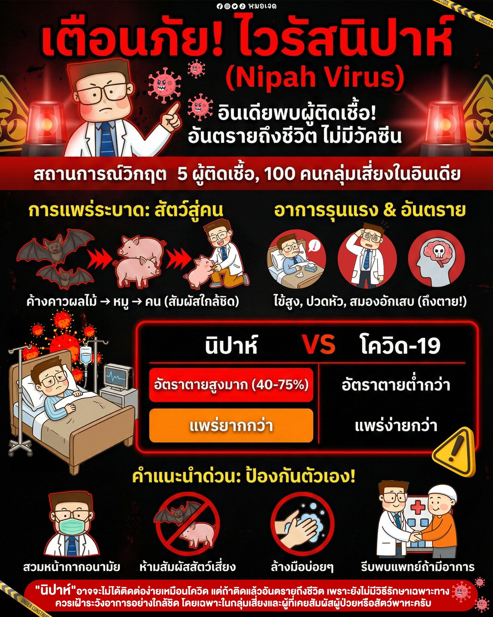 อ่านข่าวต้นฉบับได้ที่ : หมอเจด เผย 5 เรื่องจริง ไวรัสนิปาห์ ที่คนส่วนใหญ่ไม่รู้ ไม่ได้ติดแค่จากค้างคาว