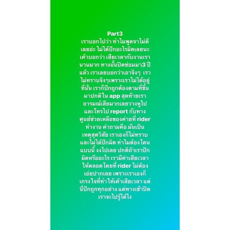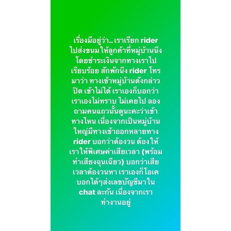 ทั้งหมดคือเราพูดดีก่อนนะ โทรหาปลายทางไม่ติดก็มาพูดจาไม่ดีกับเรา วนหาทางไม่เจอก็มาหงุดหงิดใส่เรา หาว่าเราผิดไปหมด เสียเวลางั้นงี้ เราจะไปรู้ได้ไง เราไม่ได้อยู่หมู่บ้านนั้น เข้าใจว่าอากาศมันร้อน แต่อย่าใจร้อนตามอากาศ พูดดีๆกับหนูก็ได้นะจ๊ะพี่จ๋าาาาาา