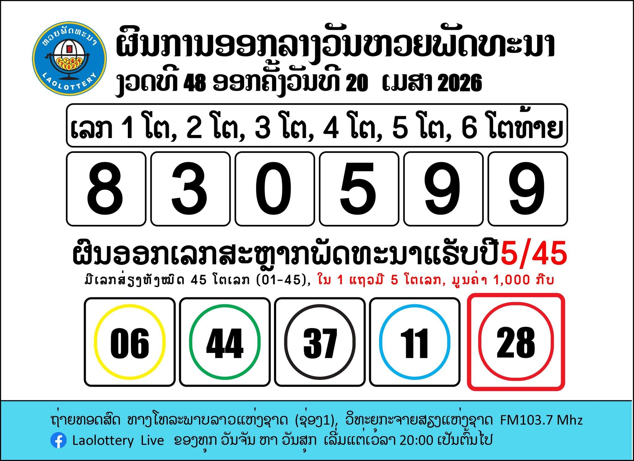 สรุปผลการออกรางวัลสลากกินแบ่งรัฐบาล สปป.ลาว หรือ หวยพัฒนา ภายใต้การกำกับของกระทรวงการเงิน งวดล่าสุดวันที่ 20 เมษายน 2569 ผลรางวัลทั้งหมดมีดังนี้