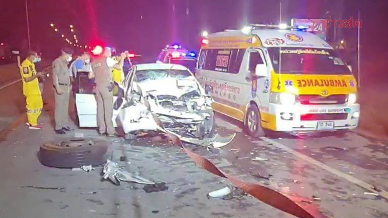 เก๋งซิ่งตีคู่รถตู้ ก่อนพุ่งเสยท้าย6ล้อห้องเย็น พังยับดับ2 พบในรถมีปืน เงินสดปึกใหญ่