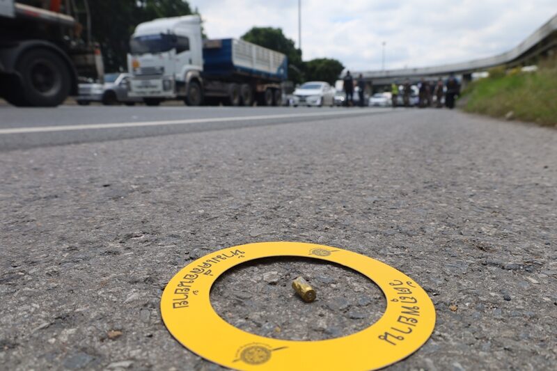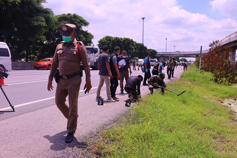 ต่อมาเมื่อเวลา 12.00 น. ที่ริมถนนสายเอเชีย ขาออก ช่วงสะพานกลับรถหน้าห้างสรรพสินค้าบิ๊กซี หลักกิโลเมตรที่ 15 ต.บ้านกรด อ.บางปะอิน จ.พระนครศรีอยุธยา ชุดสืบสวน สภ.บางปะอิน พร้อมกำลังเจ้าหน้าที่ตำรวจพิสูจน์หลักฐานพระนครศรีอยุธยา เจ้าหน้าที่ตำรวจเก็บกู้วัตถุระเบิด กองกับการสืบสวน ตำรวจภูธรจังหวัดพระนครศรีอยุธยา ร่วมกันนำอุปกรณ์ตรวจหาโลหะ เพื่อหาปลอกกระสุนปืน
