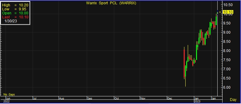 ผู้สื่อข่าวรายงานว่า วันนี้ (30 ม.ค.66) ราคาหุ้น บริษัท วอริกซ์ สปอร์ต จำกัด (มหาชน) หรือ WARRIX ณ เวลา 11:02 น. อยู่ที่ระดับ 10.10 บาท บวก 0.25 บาท หรือ 2.54% สูงสุดที่ระดับ 10.20 บาท ต่ำสุดที่ระดับ 9.95 บาท ด้วยมูลค่าการซื้อขาย 55.15 ล้านบาท