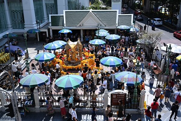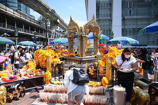 แม่ค้า กล่าวต่อว่า ลักษณะของนักท่องเที่ยวกลุ่มนี้ไม่ได้มาไหว้สักการะบูชาพระพรหมธรรมดา แต่มาแก้บนด้วย จึงได้บูชาหลายอย่าง ทั้งดอกไม้ ธูปเทียน หมากพูล ตุ๊กตานางกวัก ช้าง และปล่อยนก ซึ่งราคาของสำหรับไหว้สักการะบูชาพระพรหมมีหลายราคาแล้วแต่ลูกค้าจะตัดสินใจ