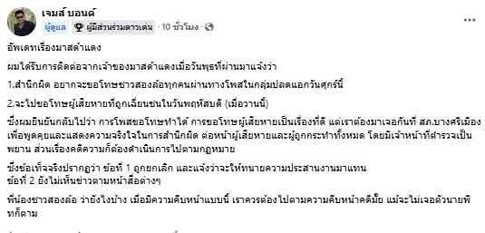 ซึ่งผมยืนยันกลับไปว่า การโพสต์ขอโทษทำได้ การขอโทษผู้เสียหายเป็นเรื่องที่ดี แต่เราต้องมาเจอกันที่ สภ.บางศรีเมือง เพื่อพูดคุยและแสดงความจริงใจในการสำนึกผิด ต่อหน้าผู้เสียหายและผู้ถูกกระทำทั้งหมด โดยมีเจ้าหน้าที่ตำรวจเป็นพยาน ส่วนเรื่องคดีความก็ต้องดำเนินการไปตามกฏหมาย