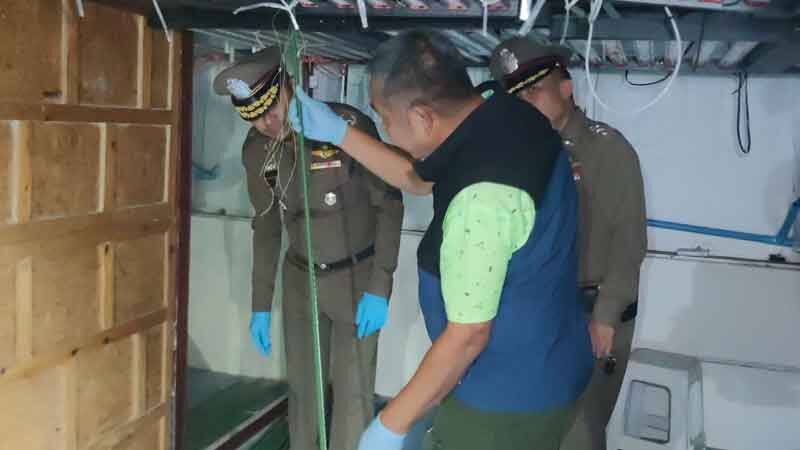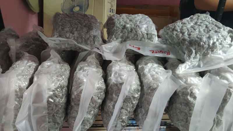 จากการตรวจสอบ ชั้น1 พบกระเป๋าเดินทางใบใหญ่วางอยู่ 4 ใบด้านในมีดอกกัญชาอบแห้งอัดเต็มกระเป๋า ชั้นลอยเป็นห้องเก็บกัญชาที่บรรจุถุงแล้ว ชั้น 2 เป็นห้องสำหรับแพ็กกัญชาใส่ถุงสุญญากาศ มีเครื่องซีลสุญญากาศ 4 เครื่อง เครื่องชั่งดิจิทัล 2 เครื่อง ดอกกัญชาอบแห้งบรรจุในถุงซิปขนาดใหญ่จำนวนมาก บางส่วนถูกแพ็กใส่ถุงสุญญากาศไว้แล้ว ชั้นที่ 3 และ 4 ดัดแปลงเป็นที่ปลูกกัญชา มีการติดตั้งอุปกรณ์ให้น้ำ แสงแดดเทียมไว้ แต่ไม่พบต้นกัญชา จึงทำการตรวจยึดไว้ตรวจสอบ