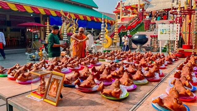 เจ้าของธุรกิจ นำหัวหมู 99 หัว แก้บน หลวงพ่อสมหวัง หลังบนขอให้ยอดขายปัง สมหวังดังปรารถนา แห่ส่องเลขเด็ดหางประทัด ได้เลข 5 ตัวลุ้นเสี่ยงโชค