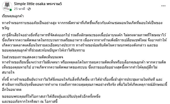 วันที่ 26 พ.ค. 2568 ร้านอาหารญี่ปุ่น Simple little osaka พระราม5 โพสต์ชี้แจงดรามาลูกค้าได้รับเค้กแซลมอนวันเกิดไม่ตรงปกกับที่ลงโฆษณาของร้าน ระบุว่า เรียนคุณลูกค้า ทางร้านขอกราบขออภัยเป็นอย่างสูง จากกรณีดราม่าที่เกิดขึ้นเกี่ยวกับเค้กแซลมอนวันเกิดที่มอบให้เป็นของขวัญ
