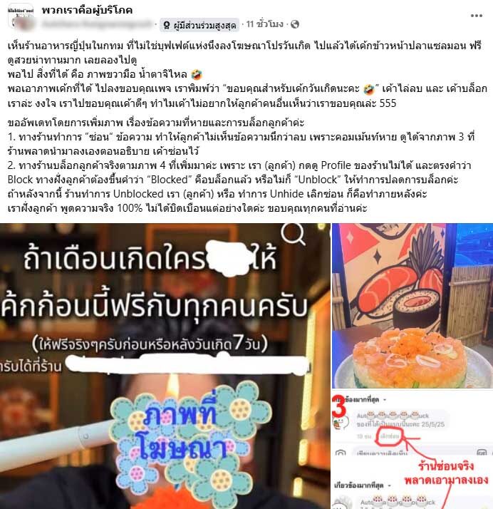 ร้านอาหารญี่ปุ่น แจงเสิร์ฟเค้กแซลมอน ไม่ตรงปก บอกเปลี่ยนเชฟใหม่ ปัดบล็อกลูกค้า ไม่ได้ซ่อนคอมเมนต์ คาดระบบผิดพลาด ขออภัยจากใจจริง