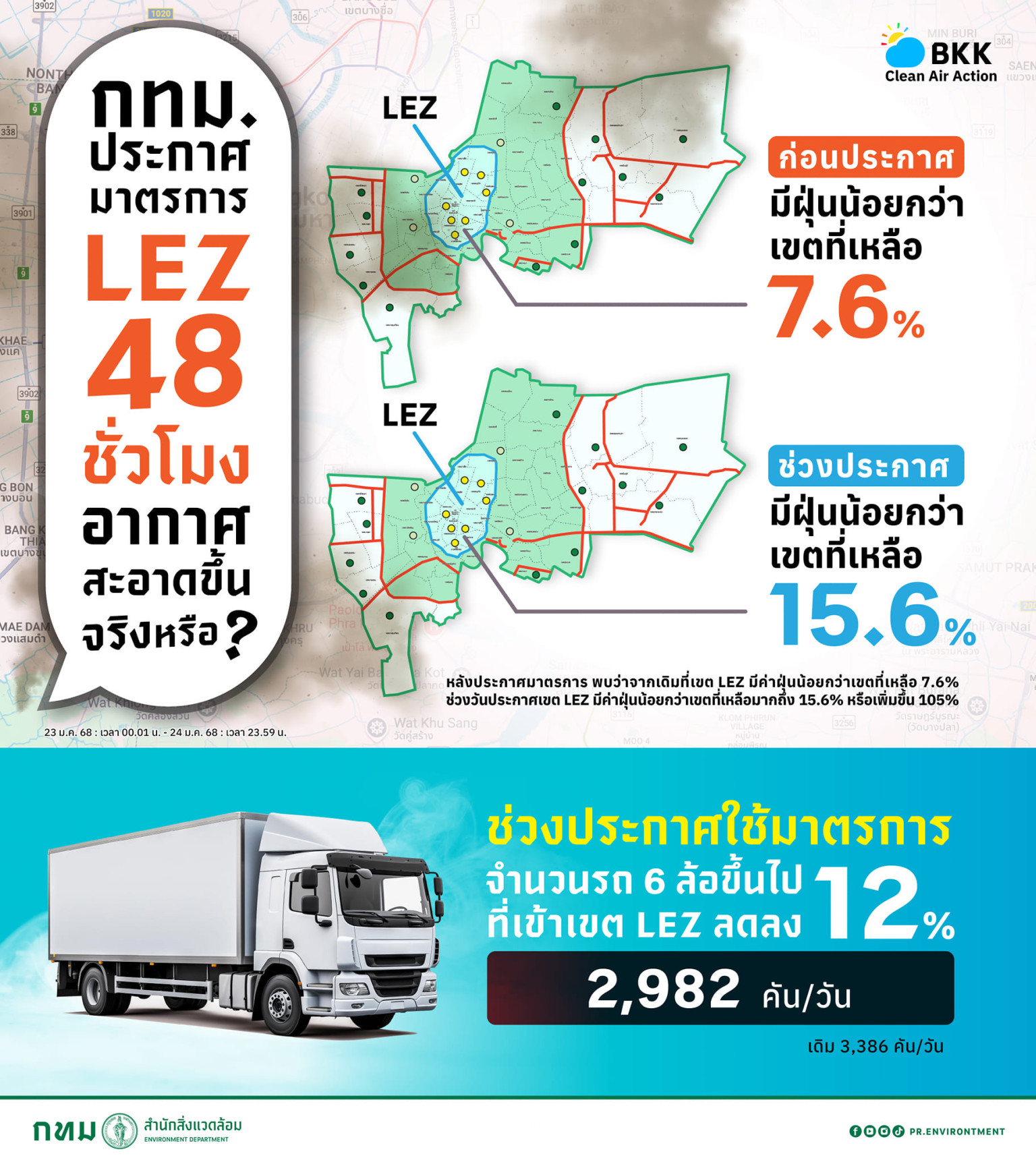 จากการประกาศใช้มาตรการ ตั้งแต่วันที่ 23 ม.ค.68 เวลา 00.01 น. ถึง 24 ม.ค.68 เวลา 23.59 น. พบว่าจากเดิม เขต LEZ มีค่าฝุ่นน้อยกว่าเขตที่เหลือ 7.6% ช่วงวันประกาศเขต LEZ มีค่าฝุ่นน้อยกว่าเขตที่เหลือถึง 15.6% หรือเพิ่มขึ้น 105% มีรถ 6 ล้อขึ้นไปเข้าเขต LEZ น้อยลง 12% หรือ 2,982 คัน/วัน จากเดิม 3,386 คัน/วัน หรือเฉลี่ยลดลงวันละ 404 คัน