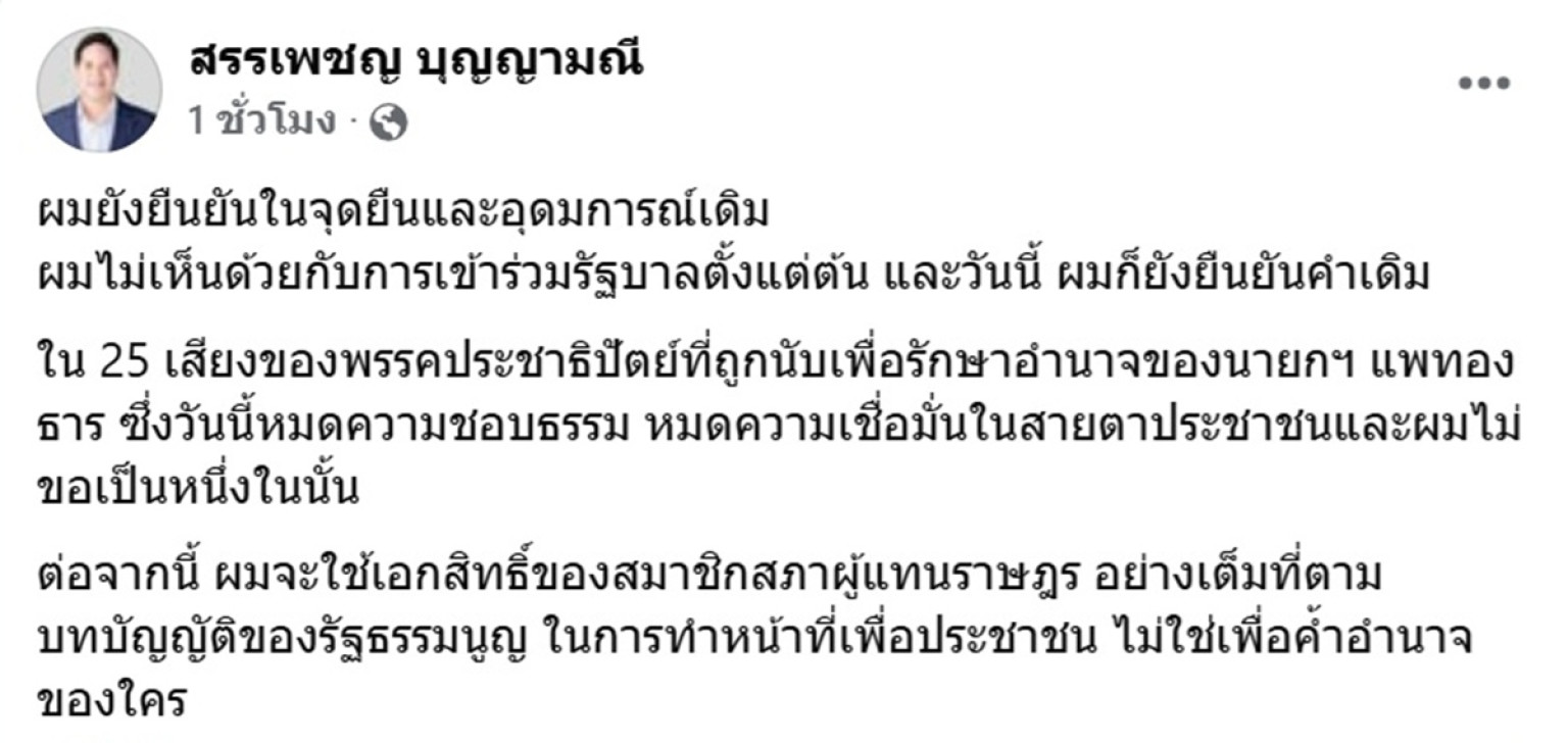 เมื่อวันที่ 19 มิ.ย.68 นายสรรเพชญ บุญญามณี สส. สงขลา พรรคประชาธิปัตย์ โพสต์ข้อความผ่านเฟซบุ๊กระบุว่า "ผมยังยืนยันในจุดยืนและอุดมการณ์เดิม ผมไม่เห็นด้วยกับการเข้าร่วมรัฐบาลตั้งแต่ต้น และวันนี้ ผมก็ยังยืนยันคำเดิม