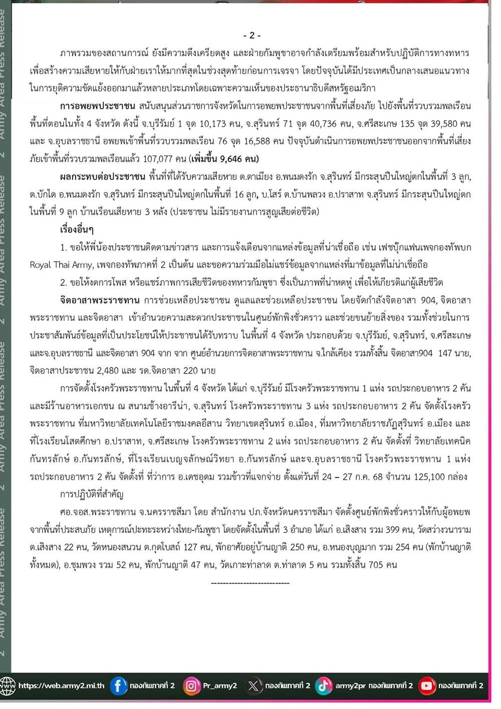 ตามที่เกิดสถานการณ์สู้รบตามแนวชายแดนไทย-กัมพูชา ศูนย์ปฏิบัติการกองทัพภาคที่ 2 สรุปผลการปฏิบัติที่สำคัญ ดังนี้