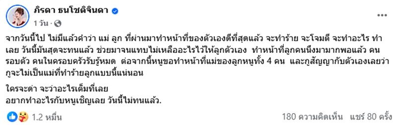 เดือดประกาศตัดแม่แล้วแม่น้ำหนึ่ง ภิรดา โพสต์ข้อความว่า “จากวันนี้ไป ไม่มีแล้วคำว่า แม่ ลูก ที่ผ่านมาทำหน้าที่ของตัวเองดีที่สุดแล้ว จะทำร้าย จะโจมตี จะทำอะไร ทำเลย วันนี้มันสุดจะทนแล้ว ช่วยมาจนแทบไม่เหลืออะไรไว้ให้ลูกตัวเอง ทำหน้าที่ลูกคนนึงมามากพอแล้ว คนรอบตัว คนในครอบครัวรับรู้หมด ต่อจากนี้หนูขอทำหน้าที่แม่ของลูกหนูทั้ง 4 คน และกูสัญญากับตัวเองเลยว่า กูจะไม่เป็นแม่ที่ทำร้ายลูกแบบนี้แน่นอน ใครจะด่า จะว่าอะไรเต็มที่เลย อยากทำอะไรกับหนูเชิญเลย วันนี้ไม่ทนแล้ว.”