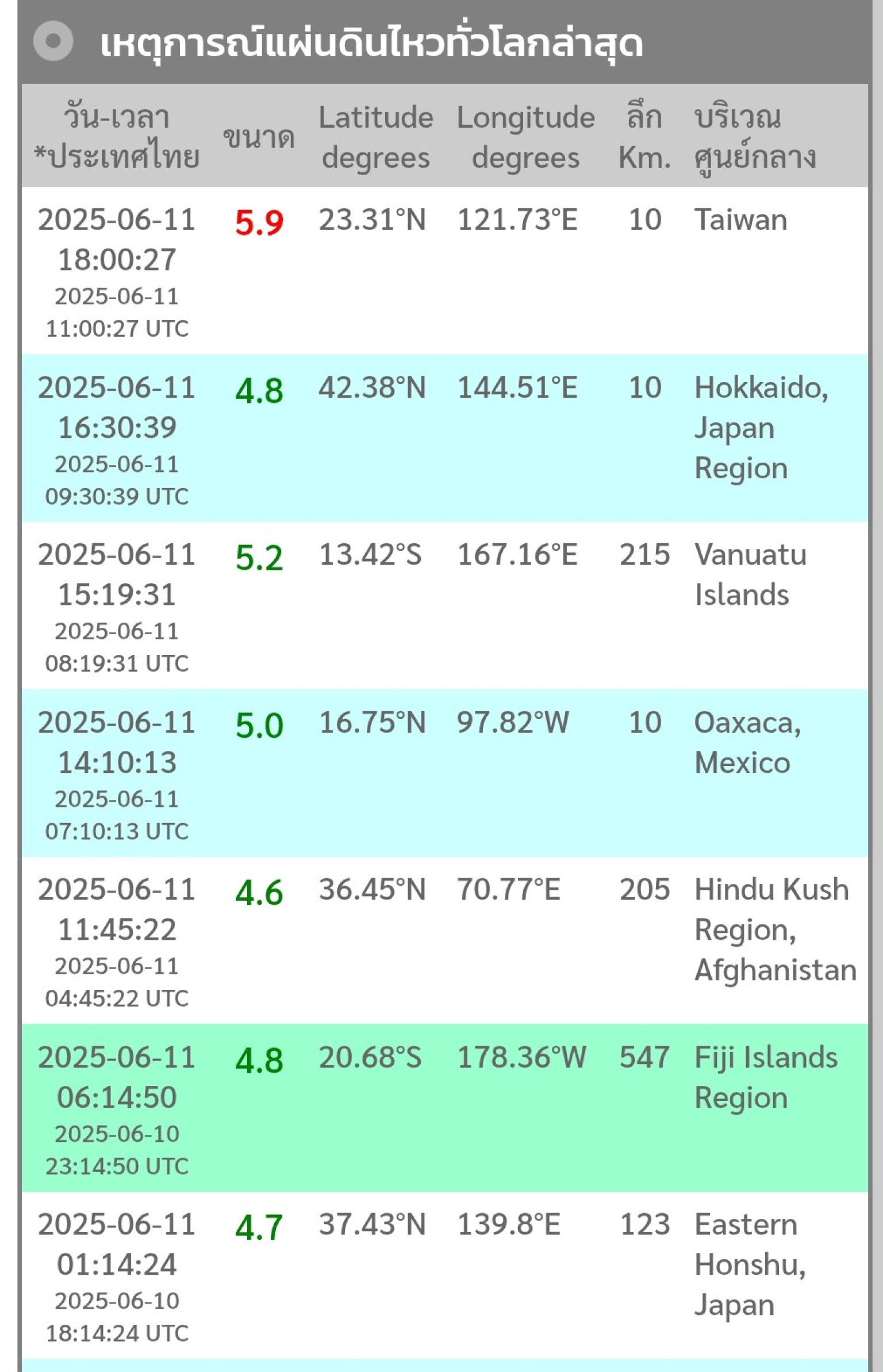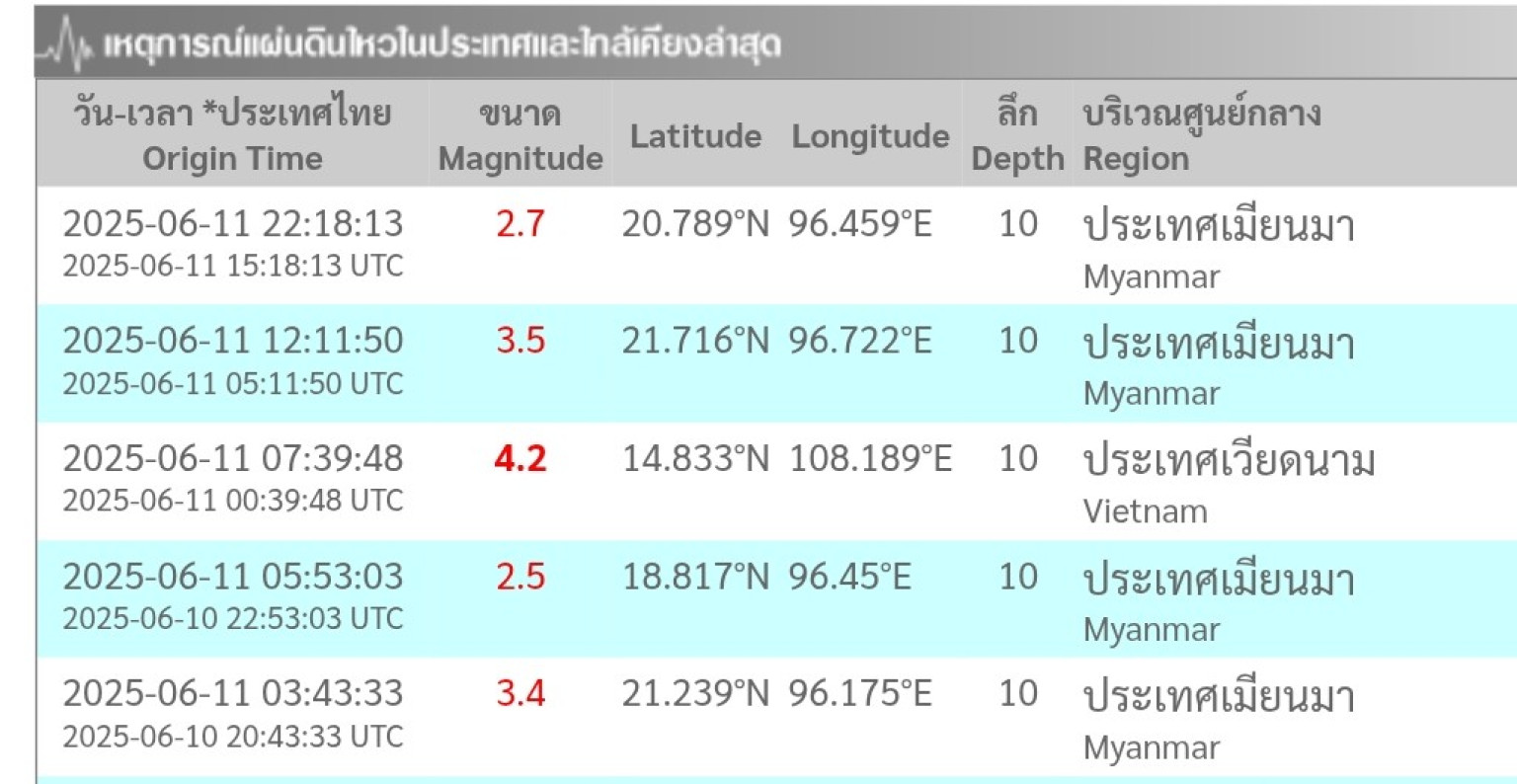 วันที่ 11 มิ.ย.68-รายงานข่าวจากกองเฝ้าระวังแผ่นดินไหว กรมอุตุนิยมวิทยา แจ้งว่า เมื่อเวลา 18.00น.ตามเวลาของไทย ได้เกิดแผ่นดินไหวขนาดความรุนแรง5.9ริกเตอร์ ขนาดความลึก 10กม.ที่ประเทศไต้หวัน ซึ่งนับเป็นแผ่นดินไหวรุนแรงสุดของตลอดวันนี้ นอกจากนี้ยังเกิดในเมียนมาวันนี้อีก 5ครั้ง และเกิดเหตุแผ่นดินไหวประเทศทั่วโลกอื่นๆรวม 7ครั้งด้วยกัน โดยหากนับรวมเมียนมาด้วยแล้วเท่ากับตลอดวันนี้เกิดเหตุแผ่นดินไหวทั่วโลกรวม 12 ครั้งด้วยกัน
