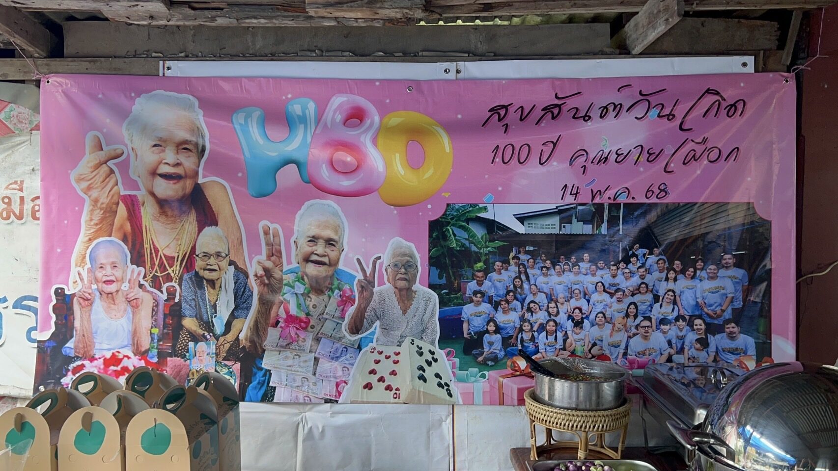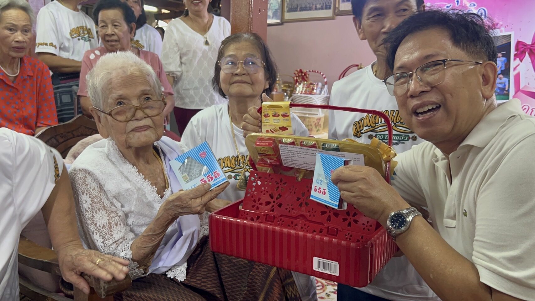 โดยบรรยากาศภายในงานเต็มไปด้วยลูก หลาน เหลน โหลน ญาติพี่น้อง รวมถึงมิตรสหายที่เคารพรักคุณยาย ต่างนำกระเช้าของขวัญเพื่อสุขภาพมาร่วมแสดงความยินดี แต่ที่ถูกใจคุณยายที่สุดน่าจะเป็นกระเช้าเพื่อสุขภาพ ที่ด้านหลังกระเช้าได้ใส่ตัวช่วยเกี่ยวกับการบวกเลขไว้ 2 สำรับ