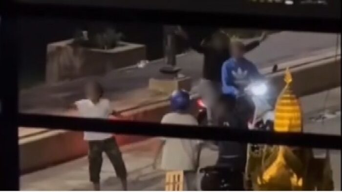 โดยในคลิปจะเห็นวัยรุ่นชายกลุ่มหนึ่งซึ่งถือมีดดาบยาวในมือหลายคน ตะโกนท้าทายวัยรุ่นอีกฝั่งหนึ่งว่า "มึงอย่าเอากฎหมายมาคุยกับกู กฎหมายมันทำเฮียอะไรไม่ได้" จากนั้นวัยรุ่นฝั่งที่ถือมีดตะโกนท้าทายก็วิ่งกรูจะไปทำร้ายวัยรุ่นอีกฝั่ง สักพักได้ยินเสียงคล้ายปืนและระเบิดดังขึ้นหลายครั้ง ก็เห็นวัยรุ่นฝั่งที่มีมีดขับรถจักรยานยนต์และวิ่งหนีไป
