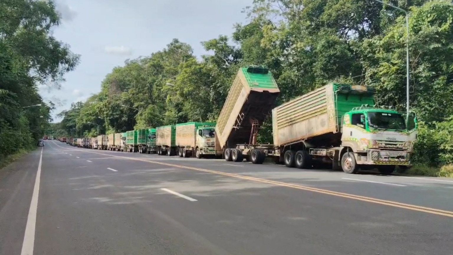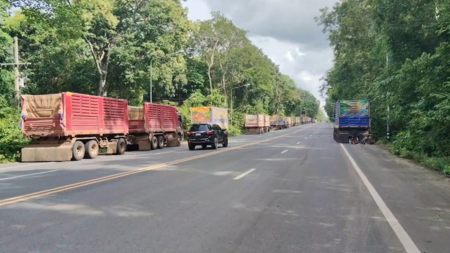 สุรินทร์ รถบรรทุกพ่วงร่วม 50 คัน จอดจองคิวรอข้ามแดนไปขนมันสัมปะหลังที่กัมพูชา วุ่นกับข่าวลือสั่งห้ามนำเข้าหรือแค่คุมเข้ม