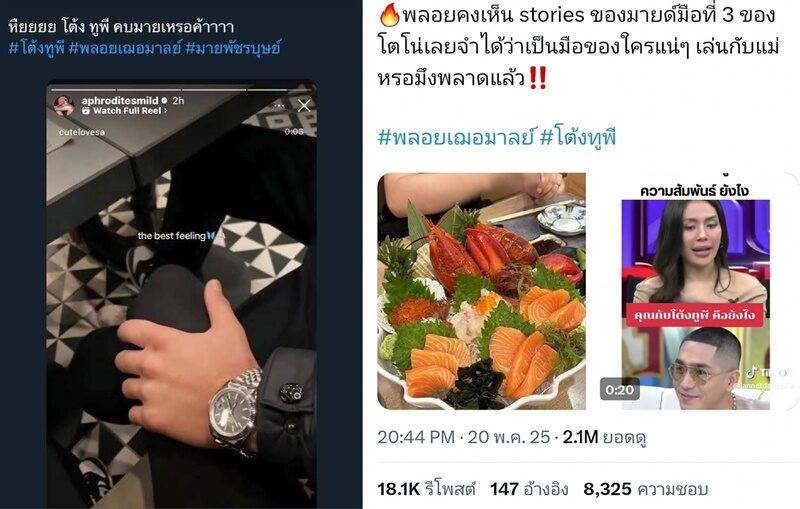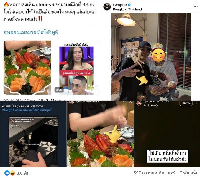 จากกรณี แห่โฟกัส มายด์ อดีตเลขาฯ โตโน่ ภาคิน และอดีตเคยไปกุ๊กกิ๊กเป็นคนคุยกับ โต้ง ทูพี อยู่ช่วงเวลาหนึ่ง ช่วงที่ โต้ง ทูพี เลิกกับ ปราง กัญญ์ณรัณ โพสต์สตอรี่ไปกินอาหารญี่ปุ่น แล้วติดมือผู้ชายมาด้วย ซึ่งเป็นนิ้วมือคนในภาพคล้ายกับนิ้วมือของโต้ง และแหวนก็ดันไปคล้ายกับแหวนของโต้งที่ใส่ประจำอีกด้วยก่อนจะลบทิ้งไป จังหวะเดียวกับที่ พลอย เฌอมาลย์ โพสต์เดือดถึงโต้งทูพี พอดีนั้น