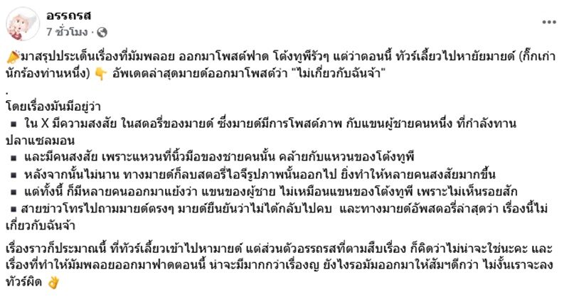 ด้าน เพจ อรรถรส ก็โพสต์เช่นกันว่า “ ใน X มีความสงสัย ในสตอรี่ของมายด์ ซึ่งมายด์มีการโพสต์ภาพ กับแขนผู้ชายคนหนึ่ง ที่กำลังทานปลาแซลมอน