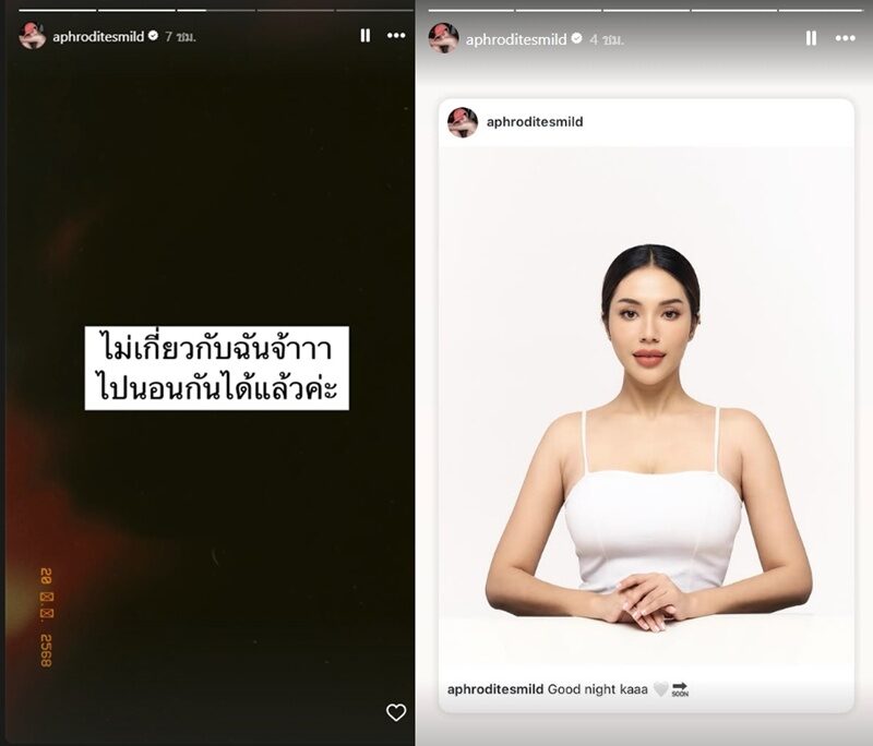 แต่ล่าสุด มายด์ ก็โพสต์ประกาศลงสตอรี่ข้อความว่า “ไม่เกี่ยวกับฉันจ้าาา ไปนอนกันได้แล้วค่ะ” พร้อมทั้งโพสต์อีกว่า “Good night kaaa ” ซึ่งก็มีคอมเมนต์ทั้งมองว่า งานนี้ มายด์ น่าจะไม่เกี่ยว บ้างก็มองว่าแล้วลบสตอรี่ทำไม เป็นต้น