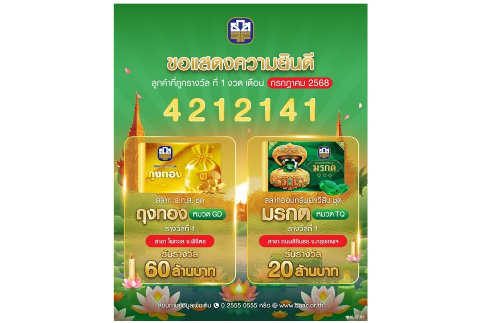 รับ 60 ล้านแบบฉ่ำ ขอแสดงความยินดีกับลูกค้าที่ถูกรางวัลที่ 1 ครั้งที่ 21/24 รับเต็ม ๆ รางวัล GRAND PRIZE 60 ล้านบาท "สลาก ธ.ก.ส. ชุดถุงทอง” งวดประจำเดือนกรกฎาคม 2568 รอบนี้เป็นของลูกค้าสาขาโพทะเล จังหวัดพิจิตร
