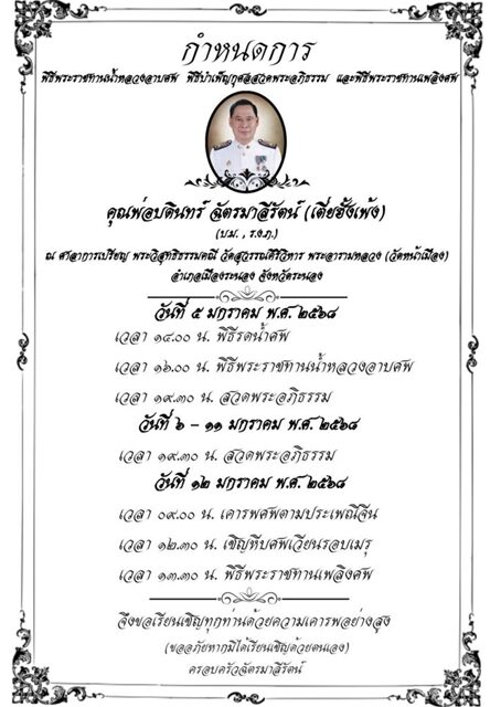 วันที่ 6 ม.ค.2568 ผู้สื่อข่าวรายงานว่า ที่ศาลาการเปรียญ พระวิสุทธิธรรมคณี วัดสุวรรณคีรีวิหาร พระอารามหลวง (วัดหน้าเมือง) จ.ระนอง ได้มีพิธีพระราชทานน้ำหลวงอาบศพ นายบดินทร์ ฉัตรมาลีรัตน์ (เตี่ยฮั้งเพ้ง) อดีตนายกองค์การบริหารส่วนจังหวัดระนอง 2 สมัย บิดาของ นายคงกฤษ ฉัตรมาลีรัตน์ สส.ระนอง พรรคภูมิใจไทย โดยมี นายพิพัฒน์ รัชกิจประการ รัฐมนตรีว่าการกระทรวงแรงงาน เป็นประธาน