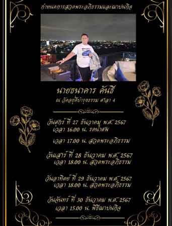ก่อนที่จะมีการสวดอภิธรรมทั้งหมด 3 วัน ส่วนในวันที่ 28-29 ธ.ค. จะมีการสวดอภิธรรมในเวลา 18.00 น. และที่ในวันที่ 30 ธ.ค. จะมีการฌาปนกิจในเวลา 15.00 น. ซึ่งบรรยากาศภายในวัดยังเป็นไปด้วยความเงียบสงบ ยังไม่มีใครเดินทางมาที่วัดแต่อย่างใด