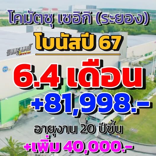 เมื่อเพจมนุษย์โรงงาน ออกมาโพสต์ว่า "สะออนเงินบวกแท้ #โบนัสปี67 โคมัตซุ เซอิกิ (ระยอง) ได้รับโบนัส 6.4 เดือน บวกเงินพิเศษ 81,998 บาท ถ้าอายุงานครบ 20 ปี บวกเงินพิเศษอีก 40,000 บาท สุดดดดยอดโบนัสแห่งปี 67 ของทางระยอง วาสนาแนน้อ"