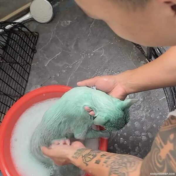 พวกเขาอาบน้ำฟอกสบู่ให้หลายรอบ จนสีเขียวที่เหนียว ออกไปเยอะมาก แต่ก็ยังไม่หมดก็คงต้องรอเวลาสักพัก หรืออาจะมีวิธีการอื่นช่วยเหลือน้อง