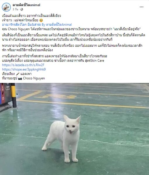 โดย เพจเฟซบุ๊ก 'ตามติดชีวิตanimal' ได้ออกมาโพสต์ พร้อมข้อความ "เบื่อแล้วแมวสีขาว อยากห้าวเป็นแมวสีเขียว
